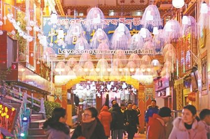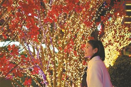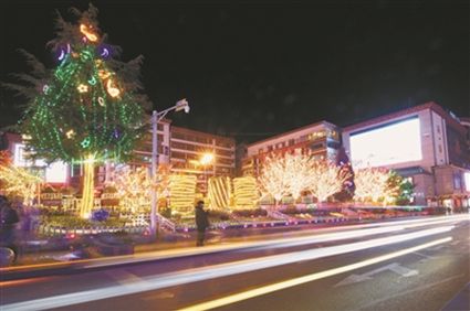 火樹(shù)銀花不夜天,流光溢彩呈繽紛?!敖衲甑囊咕罢嫫涟?!”旺姆阿姨和登增叔叔晚飯后帶著孫女來(lái)到將軍橋散步,在自己的家鄉(xiāng)欣賞到如此美妙的景色,登增叔叔忍不住夸贊。此時(shí),將軍橋道路兩旁的綠化帶在彩燈的映襯下輪廓畢現(xiàn),與玻璃棧道上的光影交相輝映,城市美景盡在其中。