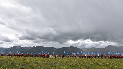 花海上、馬匹間,康巴漢子摩拳擦掌;藍(lán)天下、溪流旁,盛裝觀眾搖旗吶喊。19日,作為運動會的分項活動之一,德差鄉(xiāng)羊格貢草原上演了一場500匹駿馬在康巴漢子駕馭下同場飛奔的馬術(shù)表演視覺盛宴。伴隨著鏗鏘有力的馬蹄聲、駿馬的嘶鳴聲和觀眾的歡呼聲,一幅集奔騰之美、力量之美、風(fēng)光之美于一體的壯美畫卷快速閃過觀眾眼簾。