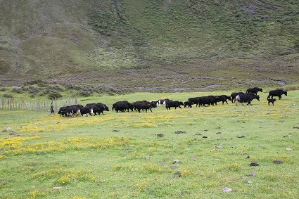 走到一處草坪,南杰和吉美下馬一起去扶雍貝,說是在此處稍作歇息。雍貝的臉色恢復(fù)了紅潤,他取下盤香枝插進(jìn)吉美濃密的頭發(fā)里,兩人由此發(fā)出了嬉笑聲。馬兒徑自走向草坪深處的水洼里飲水,打著酣暢的響鼻,頸項(xiàng)上銅鈴鐺隨馬兒鬃毛的抖動發(fā)出了“鐺鐺”的聲音。馬兒飲飽了水,轉(zhuǎn)身朝我們走來。繼續(xù)騎行,不知過了多久,日光在頭頂上游移,漸漸偏西。雍貝在前方問南杰,阿尺,巴烏牧場還有多遠(yuǎn)?南杰指向眼前的山峰說,登上這座峰頂就到了?;赝宦方?jīng)過的河谷,早已不知去向,我們身處的位置幾乎與周遭巍峨的山巒平齊了。我從衣兜里取出手機(jī)測試海拔高度,4820米。