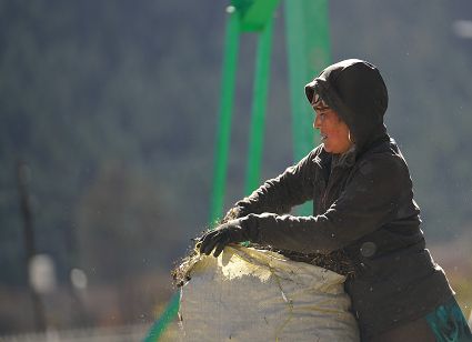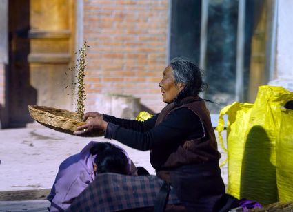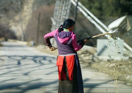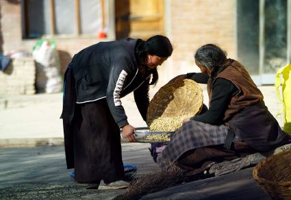 一群孩子會(huì)準(zhǔn)時(shí)來(lái)小二樓叫我,要去密林,要去山岡,要去尋找?guī)в薪?jīng)文的瑪尼石,還要去那個(gè)神秘的洞頂。比孩子們更準(zhǔn)時(shí)的是掛在小二樓上的四個(gè)大喇叭,鳥(niǎo)雀剛醒來(lái),廣播就開(kāi)始了,就必須要起來(lái)了。穿過(guò)巷道,和打豆子的人們一起享受勞動(dòng)的幸福。我們?cè)谝黄穑却挛绲膹V播,因?yàn)閺V播會(huì)給我們帶來(lái)無(wú)盡的喜悅。