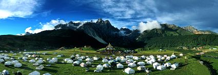 措普湖海拔4000米,屬第四紀(jì)冰磧湖,清澈碧藍(lán),為森林與草甸所環(huán)繞。湖泊東北岸的扎金甲博神山,巍峨壯觀。措普寺坐落在湖邊,寺廟、森林和湖光山色相交融,猶如仙境。