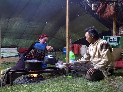 悄然而至的晨曦,隱藏著太古未盡消遁的光芒。揚(yáng)天的旌旗纏成不倒的箭桿,曾經(jīng)的故事還沒走出夢(mèng)中。草原的安謐,輕輕地?fù)嵛恐届o的牛群。奶香已浸漫晨的清新中,擠奶的姑娘臉頰已鍍上了紅霞的光暈。天地間的沉靜,只等待著第一聲牛哞的響起……草原的清晨,朝陽光臨的一刻,酥油和奶汁的淳香會(huì)醉倒那一片草色碧透的天地。