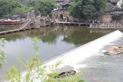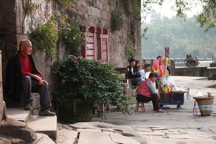 大榮橋。這座建在瀨溪河上、歷經數(shù)百年的古石橋,一頭連著大足的地盤,一頭連著榮昌的地盤,故名??创髽s橋的最佳觀景點設在大榮寨對面的萬靈山腰,從那里看大榮橋和橋拱那端毗鄰的大榮寨,一種看白描連環(huán)畫中古鎮(zhèn)的感覺,就冉冉升起了。
