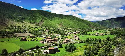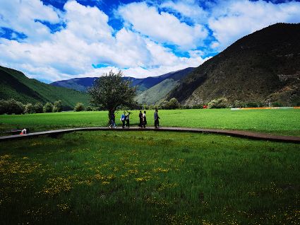 夏日,暖陽溫柔,沿途入眼皆是綠意。聽說,俄色花盛放的時(shí)候,潔白的花成簇成團(tuán),一樹樹漫山遍野,像九天的云朵堆滿山谷田野,汽車從公路疾馳,風(fēng)里都是俄色的清香。我們來的時(shí)候稍微遲了,錯(cuò)過了俄色的花期,花開荼蘼,殘花在蒼翠的枝葉里躲藏,風(fēng)里是飛舞的花瓣,紛紛揚(yáng)揚(yáng),在棕紅的棧道鋪成白色的云錦,樹下是芬芳的余味。棧道邊,金黃的雪白的野花鋪灑在翠綠的草甸上,像濃烈的水彩。地里的青稞,綠得晃人眼睛,綿延的是木雅人勤勞與希望。遠(yuǎn)處,木雅民居在各種深綠淺綠的陪襯下更加的濃墨重彩。