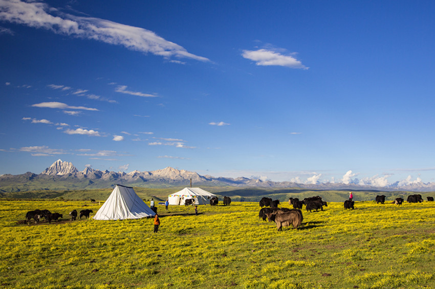 然后行走在山水之間,擁抱大自然,尋找屬于自己的“詩和遠(yuǎn)方”。油綠的青稞、小麥,散發(fā)出濃郁的田園風(fēng)味;天邊群山起伏,磅礴的氣勢瞬間感覺人在自然面前實(shí)在太渺?。粠づ顸c(diǎn)綴著開滿野花的牧場,牦牛哞鳴,一片生機(jī),細(xì)細(xì)體會(huì)牧民“逐水草而居”的生存智慧......