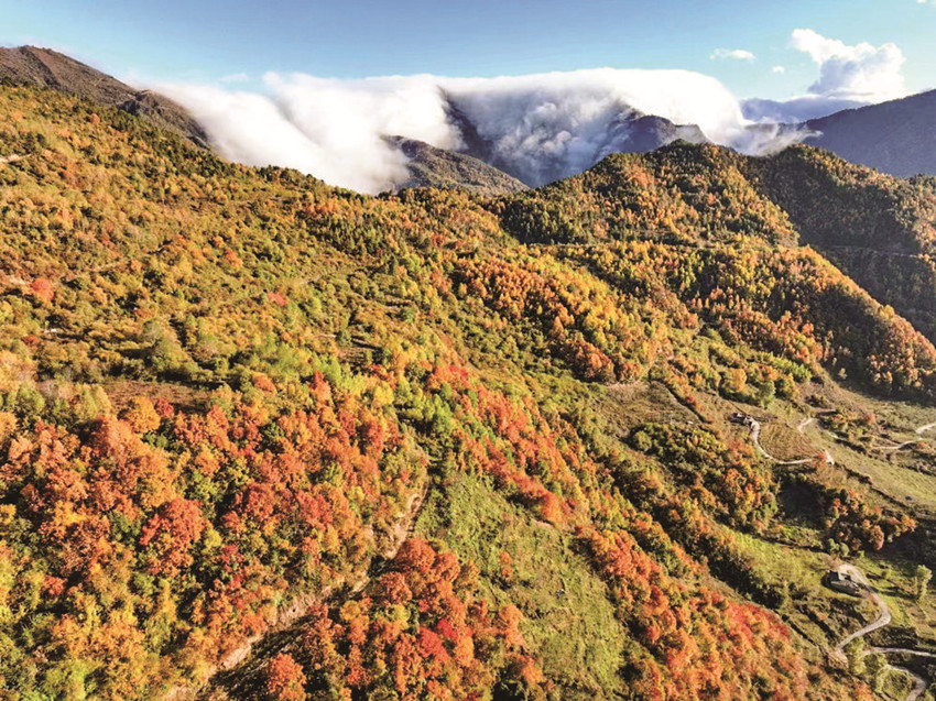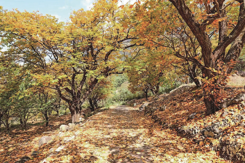 冷風(fēng)肅起,大雁南飛,銀杏樹開始了一年中最華麗的篇章,風(fēng)兒吹過,銀杏樹葉紛紛揚揚地,從樹上飄落下來,宛如無數(shù)只金色的蝴蝶,在空中漫天飛舞?!八厣鷿狻?,滿山層林盡染,演繹著另一番亮麗。多種色彩交織在一起,如同一幅流動的美麗畫卷,使得這個季節(jié)更有韻味。