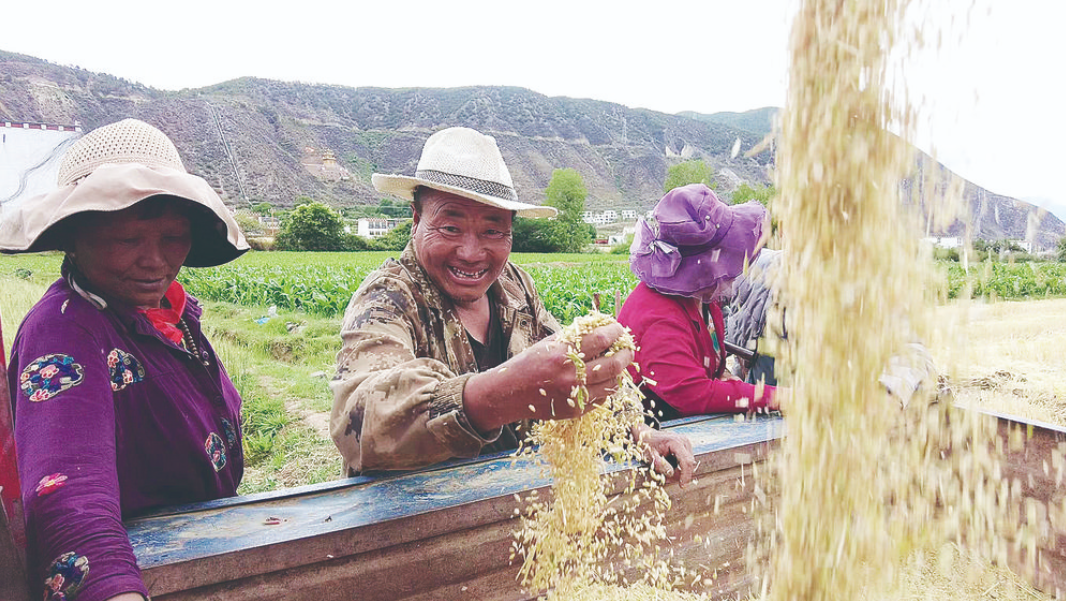 我州各地青稞、小麥陸續(xù)進(jìn)入成熟期,眼下正值“雙搶”關(guān)鍵期。放眼望去,在廣袤的田野上,一片熱火朝天的繁忙景象。村民們頭頂烈日,腳踏泥土,緊張而有序地投入到“雙搶”工作中。新型農(nóng)具為“雙搶”注入強(qiáng)大動力,收割機(jī)在田間往來穿梭,一顆顆飽滿的麥粒從倉門傾瀉而下,源源不斷地被送上拖拉機(jī),將成熟的小麥、青稞迅速收割歸倉,展現(xiàn)出一幅喜慶熱鬧的豐收畫卷。
