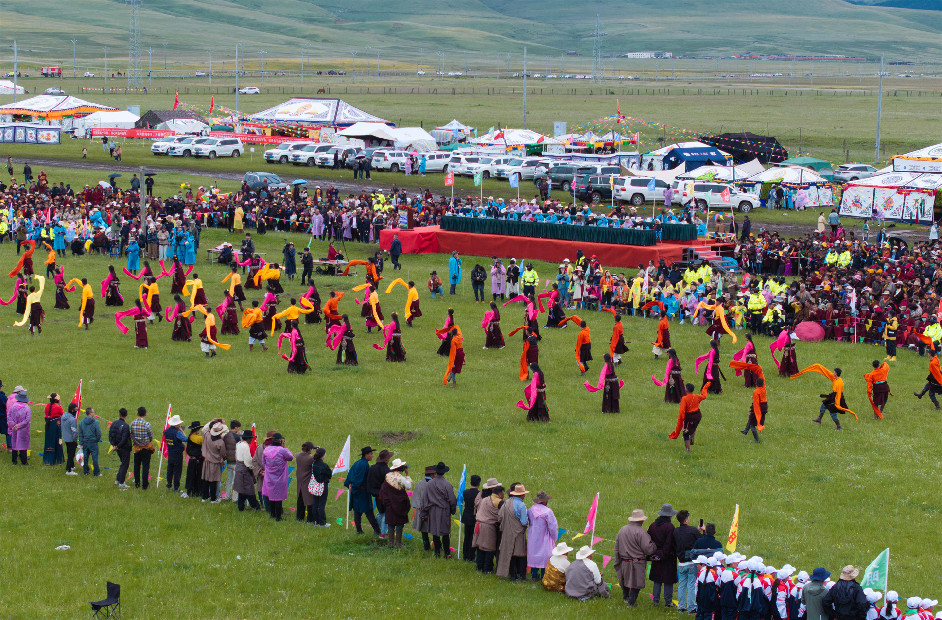 7月27日,四川省甘孜藏族自治州白玉縣第二屆“盛德白玉·草原最?!编l(xiāng)村民俗文化活動在阿察鎮(zhèn)日通草原啟幕。文藝匯演、牦牛選美、擠奶比賽、賽馬等活動在接下來兩天里將輪番上演,吸引當?shù)啬撩窈捅姸嘤慰颓皝碛^賞。
