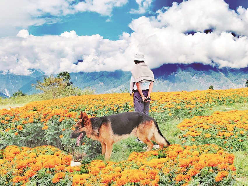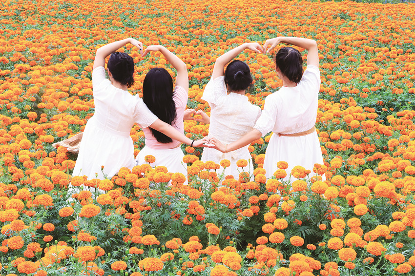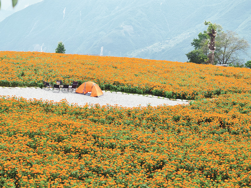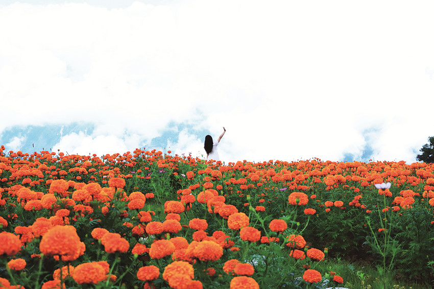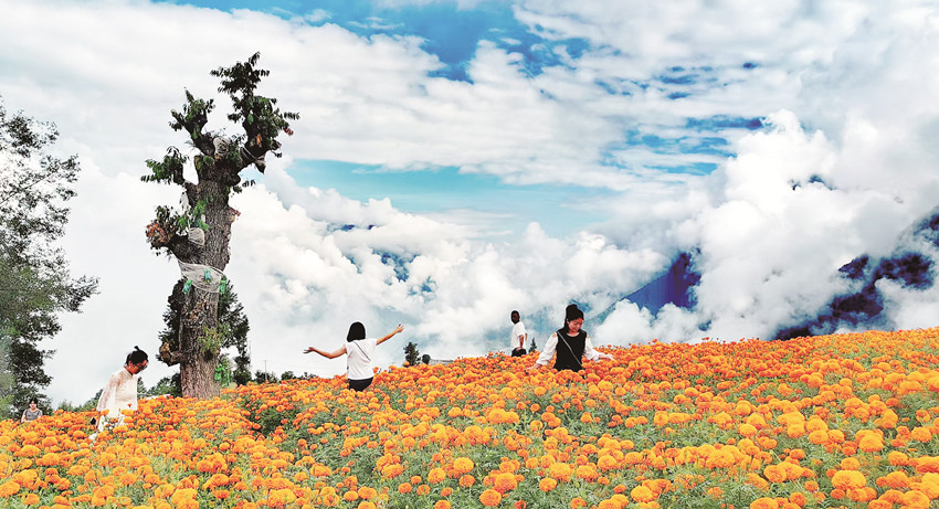 在這金風(fēng)送爽的秋日,瀘定德威加郡海子村18萬株萬壽菊競相綻放,漫步在花海之中,人們可以感受秋風(fēng)的輕撫,呼吸清新的空氣,寧靜的村寨依托著貢嘎雪山、藍(lán)天白云,在成片的萬壽菊裝點(diǎn)下構(gòu)成了一幅亮麗的鄉(xiāng)村畫卷。
