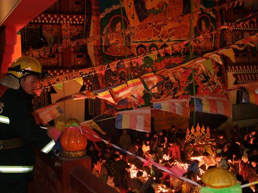 康定的幾座黃教寺廟舉行了法會,擺酥油花,燃元根燈供佛。信教群眾除在家供燈外,有的還登跑馬山,赴南無寺敬燈油。入夜后又成群結(jié)隊涌向康定城中的安覺寺,參加元根燈會,以此紀念藏傳佛教格魯派創(chuàng)始人、宗喀巴大師圓寂成佛。安覺寺里人潮涌動,熱鬧非凡。有扶老攜幼的信教群眾,有祈求平安的生意人,也有慕名而來的外地攝影師。燈會這天,最忙碌的除了寺廟里的喇嘛,就數(shù)在寺廟周圍站崗的消防員了,消防員李剛說:“一大早就有遠道而來的信教群眾和僧尼到寺廟里點燈了,為了保障寺廟的消防安全,我們已經(jīng)在這飄著雪花的冬日里站了整整一天了,要等到每一盞燈都安全的燃盡,我們才可收隊離開。”