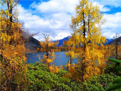 丹巴的秋是有著美麗色彩的季節(jié),你瞧,在峽谷兩岸的山巔,那一簇簇綠樹在一夜之間竟然點(diǎn)綴上了黃的、紅的顏料,就像是一名丹青能手不小心間打翻了調(diào)色盤,讓那些靈動的顏料在樹冠上潑灑。黃色的樹葉正印證了“滿樹盡帶黃金甲”的意境,黃得透徹,黃得潔凈。而那些紅色的樹葉,猶如盛開的鮮花,在逐漸蕭條的秋日里顯露出勃勃生機(jī)……那一片片黃紅綠相間的顏色,一寸一寸的往下挪移,讓看慣了春色綠野滿山的人們驚呼大自然的鬼斧神功之作。山腰,蔥綠的樹一棵連著一棵,密密層層,頑強(qiáng)地抵抗著秋風(fēng)的寥落,然而,那黃的紅的顏料終歸于要流向峽谷底,所經(jīng)之處,風(fēng)刺骨,葉瑟縮,大地又將再次被剝蝕掉華麗的外衣,露出山的嶙峋。我想,在山巔,那些樹葉在秋寒的作用下,依依不舍地與樹枝作別,隨風(fēng)抖落,在樹林中上下翻飛,猶如一只只美麗的彩蝶在林中翩翩起舞,當(dāng)落到地面上時,發(fā)出生命即將逝去時的低低嘆息聲,然而那哀傷卻沒有醞釀太久,幾只小蟲迅速地聚集在葉片底下,為尋找到過冬的庇護(hù)所而興奮不已,那些葉片也感受到了生命存在的意義,為自己即將化為塵土前還能再次發(fā)光發(fā)熱而激動。跟隨著秋的步伐,獨(dú)自一人穿行在秋色滿滿的樹林中。眼前,一片片落葉漫空飛舞,伸出雙手,讓那些黃的紅的葉片降落在手心里,一絲淡淡的蘋果香味從小小的葉片中透出,悠悠的在我鼻尖縈繞。那一片片落葉,不正是秋日向大地母親發(fā)出的明信片嗎!春夏兩季,大地母親用自己的乳汁哺育著這些葉片,泛著健康的綠色,渲染了大地,茁壯的成長。那透心的綠,將大地裝扮得格外的妖嬈,充滿了無限的活力。秋日漸近,它們在秋風(fēng)的浸透下,剝蝕掉綠色的外衣,消耗掉多汁的綠葉,逐漸的消瘦,最后薄如蟬翼,在秋風(fēng)的吹拂下,在大地母親的召喚下,終于脫離枝條,晃晃蕩蕩的飄向地面。