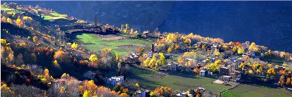 丹巴的秋似乎來得更晚一些,當(dāng)羌塘高原上的雪花從彤云密布的天空中飄灑下來,雅礱江上游滴水已成冰的時候,那秋才帶著陣陣涼意,伴隨著飄飄蕩蕩的白云,跨過雪域高原,翻過崇山峻嶺,載著五顏六色的夢想,悄悄的眷顧上這塊還郁郁蔥蔥的峽谷。就這樣,秋在不經(jīng)意間劃過峽谷兩岸,用自己特有的方式,渲染了所有的景色,漸漸瘦弱了山的肌膚。