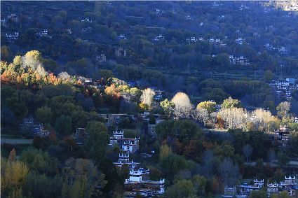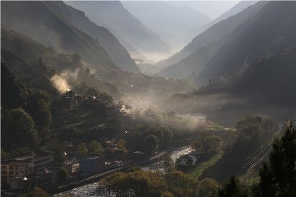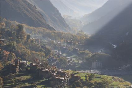 落日將最后一道霞光在山尖劃過,暗夜便裹挾這寒意搖動起山林中的樹木。風(fēng)漸緊,那已經(jīng)稀稀落落的樹葉隨著風(fēng)的韻律,跳起歡快的鍋莊,仿佛在告別這一年的繁華。突如其來的大雪,給丹巴的二月涂上白色的記號。從山尖到院前的樹上,一溜兒雪白,正應(yīng)了“忽如一夜春風(fēng)來,千樹萬樹梨花開”的情景,讓人忍不住伸出手指看看這花是真是假。大雪過后,陽光如約而至撒滿藏寨,金色陽光和蒸騰的白霧縈繞在雪白的山頭,與山下的古碉藏寨,河畔的清流巧妙地構(gòu)成一幅絕美畫卷,讓人仿佛身處仙境。吸足了養(yǎng)分的柳樹終于抽出綠芽送來春天的信號,那柳條兒在細風(fēng)吹拂下宛如少女對鏡梳妝,在陽光下顯得無比溫柔,讓人不禁想貼近它們,感受這溫暖又靜謐的溫柔。