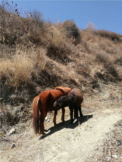 晴天里有陽(yáng)光,陽(yáng)光總是充滿愛和溫馨,無(wú)論人或是動(dòng)物,母愛都是最寶貴的甘露。行走在阿里布果,無(wú)限愜意油然而生,徜徉在陽(yáng)光的懷抱,心寧而靜。突然,馬鳴聲打破了這份寧?kù)o,一匹黃馬一邊吃著草,一邊吼叫,不一會(huì)兒,一匹小馬駒飛奔而來(lái),走到黃馬身旁,吮吸著甘甜的乳汁。天很藍(lán),陽(yáng)光很溫暖,世上有一種最美麗的聲音,那便是母親的呼喚。