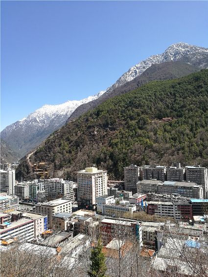 天空像剛被浸染的綢緞,蔚藍(lán)的主色已經(jīng)略顯;白雪好似從浸染的綢緞上滴落下的顏料與其它顏色的混合,眷戀的駐足在山尖,在其耳旁傾訴來(lái)年的約定;一顆顆萬(wàn)年青穩(wěn)穩(wěn)的站立,將山中的寺廟、亭閣緊緊地包圍,見證著康定四季輪回的變化;依然披著秋冬贈(zèng)予黃色外衣的樹木,拋開桎梏,堅(jiān)守在一座座樓房旁。藍(lán)與白,黃與綠……這大美的晴天為人們帶來(lái)了別樣的視覺盛宴。