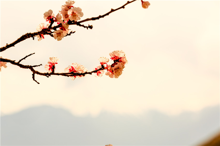 爛漫桃花的暖與遠(yuǎn)方高聳雪山的冷,