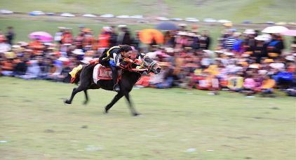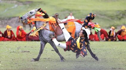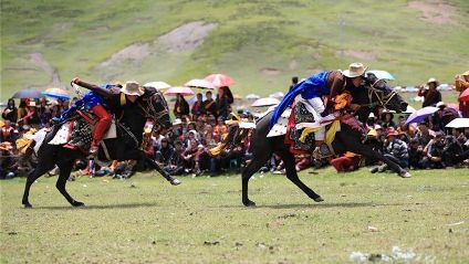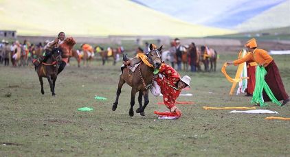 7月23日,四川甘孜藏族自治州理塘縣村戈鄉(xiāng)賽馬活動(dòng)開始,牧民們?cè)隈R背上一顯身手。每年藏歷六月,當(dāng)草原上格?;ㄊ㈤_的時(shí)候,四川省理塘縣24個(gè)鄉(xiāng)(鎮(zhèn))就會(huì)按照習(xí)俗舉辦隆重的賽馬會(huì)來(lái)拜祭神山,慶祝豐收。迄今有400多年歷史的賽馬分為耐力賽、小走賽、馬術(shù)賽等,其中最為精彩的是馬術(shù)賽:馬肚藏身、馬背倒立、飛騎射擊、拾哈達(dá)等,驚險(xiǎn)刺激。2008年6月,此項(xiàng)活動(dòng)被列入四川省級(jí)非物質(zhì)文化遺產(chǎn)保護(hù)項(xiàng)目。(朱虹 葉強(qiáng)平)