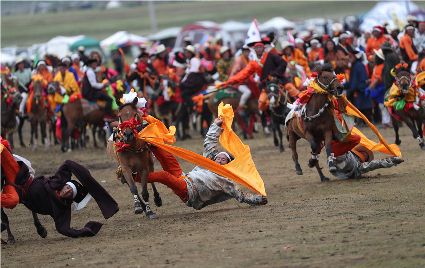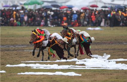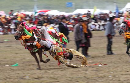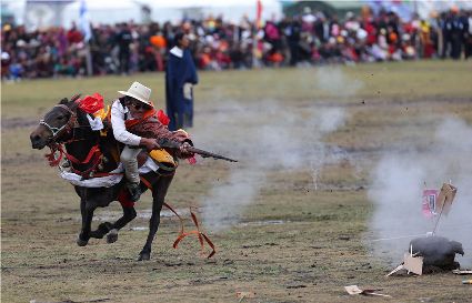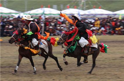 近日,在理塘縣奔戈鄉(xiāng)薩戈村八一賽馬場,來自全縣各鄉(xiāng)鎮(zhèn)近千名牧民進(jìn)行了傳統(tǒng)的馬術(shù)表演,他們以高超的騎術(shù)展演了拾哈達(dá)、馬上射擊、馬上射箭、鐙里藏身、五彩凌空等馬術(shù)技巧,把歡樂帶到草原,讓當(dāng)?shù)啬撩窈捅姸嘤慰拖硎芰艘粓鲆曈X盛宴。