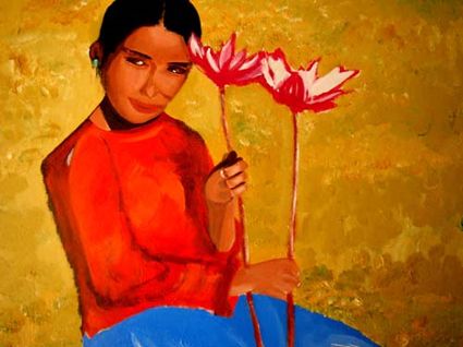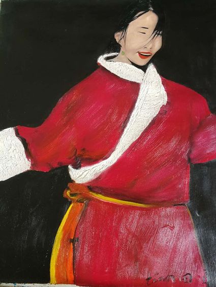 畫(huà)畫(huà)三年多了。十三歲寫(xiě)詩(shī);到了高原后,方開(kāi)始創(chuàng)作長(zhǎng)篇小說(shuō)。在上海,我做過(guò)畫(huà)廊。但要說(shuō)斗膽動(dòng)筆畫(huà)幅肖像。我是在白度母唐卡前燃了三炷香的。包括在咖啡店現(xiàn)場(chǎng)作畫(huà)。到京城繼而國(guó)外辦畫(huà)展,我認(rèn)為都是因了我把畫(huà)布當(dāng)成了詩(shī)稿的緣故。于是,大家喜歡我這種野路子,天馬行空,可又不舍方圓的創(chuàng)作手法。接下來(lái),歐洲、東京還會(huì)有我的系列展覽。