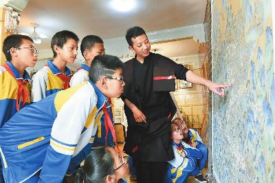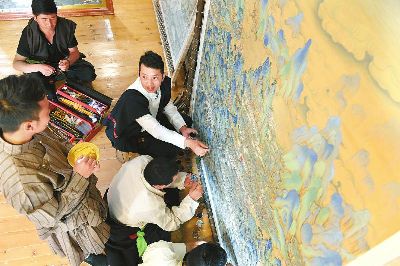 著著是當地小有名氣的畫師,他14歲從臨摹、勾線定型、著色染色開始學起,3年后就出師獨立作畫。17年時間,他繪制了3000多平方米的壁畫和數百幅唐卡,光筆就畫禿了20000多支。去年,著著憑借《南絲路一帶緣藏漢人一家親》成為當年文藝界最高獎山花獎的獲得者。今年,他圍繞“一帶一路、藏漢和睦”為主題而創(chuàng)作的大幅唐卡畫作也即將收尾。