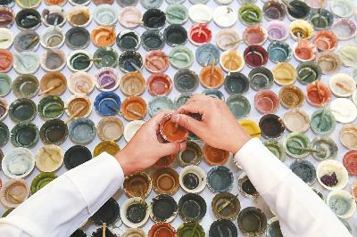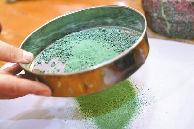 傳統的唐卡是藏族文化中一種獨具特色的繪畫藝術形式,需經繃布、打磨、定位、起稿、涂色、暈染、拉線條、拉金線等多種程序,天然原料作色保證了畫作幾百年后色澤還依然鮮艷。在著著的畫室里,擺放了百個裝滿各色礦物質顏料的調色小碗,“上色用的是延續(xù)千年的礦物研磨顏料?!睘榱俗岊伭献魃鶆颍€用自己的辦法搞出了專用的顏料攪拌機。