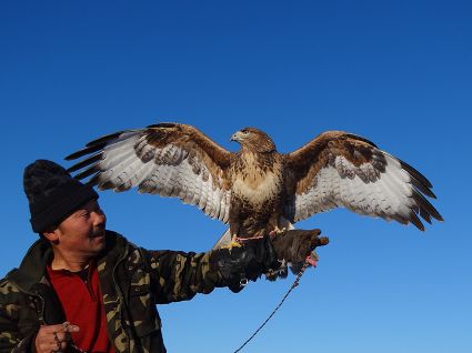 “小一點(diǎn)的鷹好訓(xùn),訓(xùn)老一點(diǎn)的叫熬鷹。 開始熬鷹前,一次性喂飽鷹,七天七夜不吃不喝不睡覺,待七天時到,放鷹于空,手中拿肉,用我們倆特殊的交流方式指揮它,這時它會落我的手臂上。但是,這一只始終沒服過我。訓(xùn)出來一只大約半月左右。”訓(xùn)鷹人說。