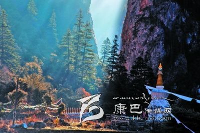 進(jìn)得溝來,卻又是另一番景致。溪水在窄細(xì)的深谷中忽隱忽現(xiàn),水聲叮咚,時(shí)而從碎石卵灘下潛淌,時(shí)而冒出雪花樣的身影,不張揚(yáng),含靦腆,與兩邊千仞峭崖的兇猛樣恰成強(qiáng)烈對(duì)比。此時(shí)容不得你不抬頭望山,望天了。極盡險(xiǎn)峻的峭壁奇峰,危巖巨石,陰面如潑了墨暈,陽(yáng)面露了慘白,硬硬地把個(gè)溝谷擠成了“一線天”,駭?shù)谜锪锏奶焐弦粌蓤F(tuán)亂云也不敢停歇片刻,欲飄走,卻又被錯(cuò)落參差的山峰撕得七零八落。更有那墨黑如黛的松柏齊齊地排隊(duì)豎立在危崖峭壁間,或一兩階,或三四階,如挎刀武士護(hù)著峭崖,又如黑大漢長(zhǎng)的亂糟糟的絡(luò)腮胡,徒增添了猙獰之貌。傳說皮察溝內(nèi)有座黑教的神山——呷拉神山,每到“朝山會(huì)”,農(nóng)牧民前去神山朝拜。然而,呷拉山頂不知何時(shí)棲居了一只碩大的“夏甲曲絨”(意為一種兇惡的鳥),不時(shí)將村里百姓的牛、羊叼到山頂吞食。藏王格薩爾得知此事,決心要除掉“夏甲曲絨”。 “夏甲曲絨”得知格薩爾王大軍前來征服它,十分懼怕,數(shù)日藏于洞中不敢出來。格薩爾王隱身于巖石背后,讓王妃珠牡設(shè)法引“夏甲曲絨”出洞。“夏甲曲絨”形體碩大,棲息的洞無法掩其全身,頭部露在外面,時(shí)時(shí)觀察動(dòng)靜。珠牡到接近洞口的地方,滔滔不絕地贊譽(yù)“夏甲曲絨”長(zhǎng)得美麗,它禁不住贊美,漸漸地伸長(zhǎng)頭頸,最后驕傲地露出潔白的全身,并高昂著頭。格薩爾王趁機(jī)迅速?gòu)埞罴?,一箭射?ldquo;夏甲曲絨”的頸部,血流滿山,以后這座山便變成了紅山。當(dāng)“夏甲曲絨”負(fù)痛逃至皮察溝“一線天”時(shí)已精疲力竭,便停留在山崖中。格薩爾王隨即趕到,藏于灌叢,背靠巨石用腳一蹬(至今天一巨石呈凹形,似有人蹬過),再次射中“夏甲曲絨”。“夏甲曲絨”負(fù)痛逃去,停在覺然村一巨石上做垂死掙扎時(shí),它的爪爪在巨石一抓了無數(shù)道溝痕,后人把這個(gè)巨大石稱為“鬼抓石”……我無意去尋找“紅山”、“腳蹬石”、“鬼爪石”等,也沒想深究格薩爾除妖是否用過“美人誘惑計(jì)”,但卻在溝谷里發(fā)現(xiàn)一個(gè)與眾不同的現(xiàn)象:在一處窄小的谷地路傍,長(zhǎng)滿了雜枝黑蔓的灌叢,灌叢上彩幡密布,鉆進(jìn)灌叢,里邊竟然塑了一尊格薩爾王的神象,神象不高大,卻威儀,的確像是藏在崖壁下灌叢中……很容易讓人想到故事中的情節(jié)。