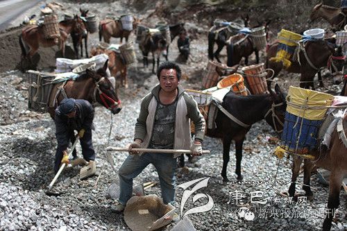 每天早上6點(diǎn)多,王玉海和同伴趕著騾子隊(duì),從白玉縣縣城旁邊的住地步行約1小時(shí)到達(dá)德沙村,約8開(kāi)始從離索道橋約300米的路邊沙石場(chǎng)裝運(yùn)碎石。他們通常工作到下午5點(diǎn),每只騾子在海拔3000米左右的高度,來(lái)回運(yùn)送20次左右,每只騾子運(yùn)輸碎石大約在3000公斤左右。這些騾子正當(dāng)強(qiáng)壯年,年齡大約在三四歲,通常在坡度在30度以下的,最大負(fù)重約800斤。