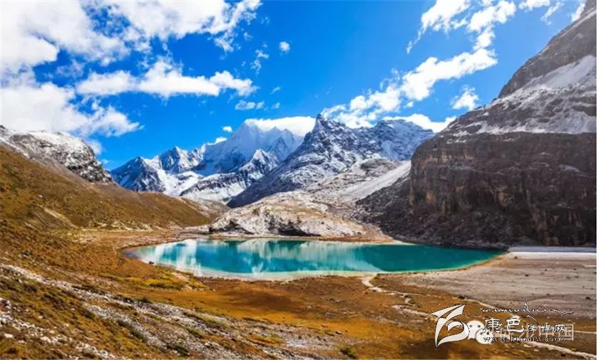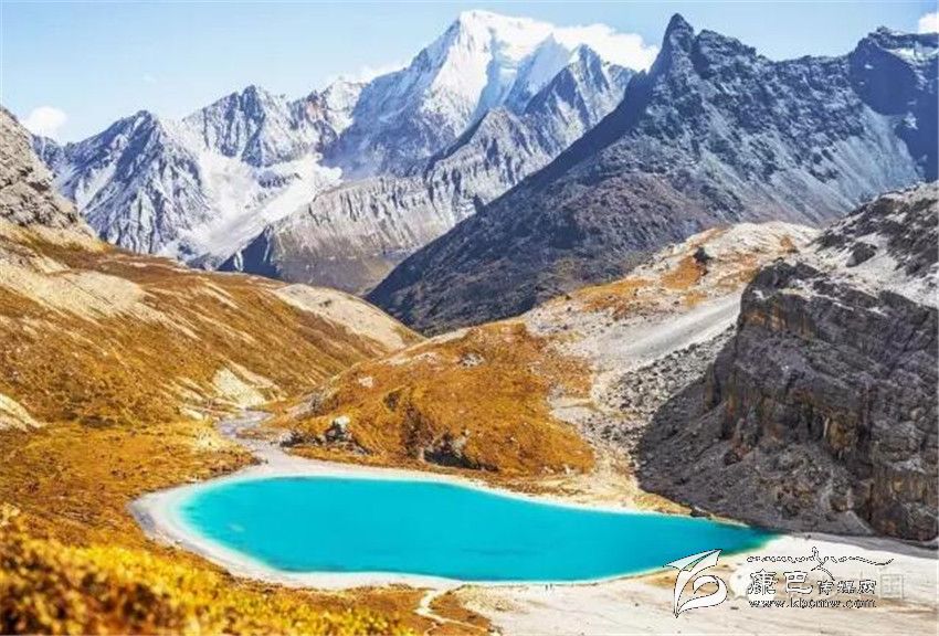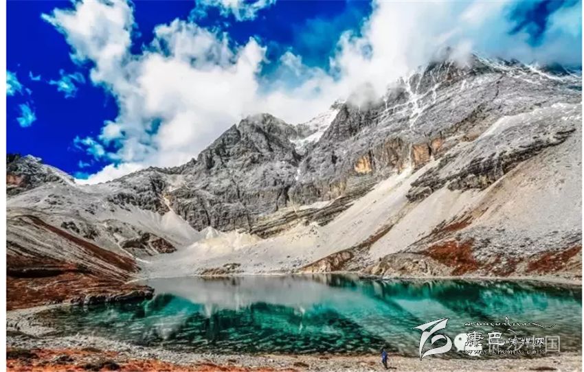 三神山中間的牛奶海,美麗的高原堰塞湖,面積0.5公頃,海拔4500米,四周雪山環(huán)繞,湖水清瑩碧藍(lán),山上成瀑,以其玲瓏秀雅水色翠藍(lán)而著名,牛奶海上方有大片的冰川。傳說(shuō)每年春暖花開之時(shí),湖水會(huì)像牛奶一樣潔白如瓊漿,并因此得名牛奶海。