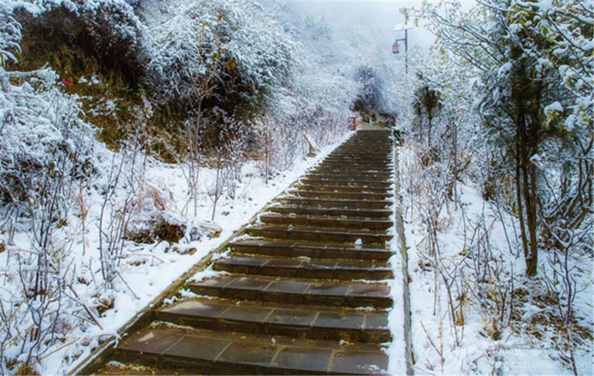 鋪滿“雪凇”的山谷,遠看像森林撒上了一層糖霜,有人可能會誤認為是東北的“霧凇”,但這種“雪凇”的白色底下還能看見隱約看到秋林的枝葉,獨有的南國雪景讓人產(chǎn)生“似花非花”的迷惑。