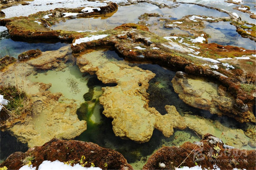 灘長約3000米,寬約200米,共有7個臺階,上面形成了大小不一的彩池,里面的各類水生植物,暢游的羌活魚(小鯢)等,給這片古老的地質奇觀帶來了無限的生機。在海拔4300米處,有一眼噴出1.5米高的溫泉,水溫常年在30度左右,是玉龍泉華灘的主要水源。