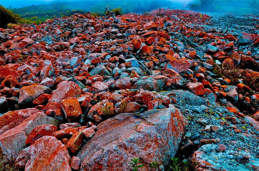 據中科院的研究,石頭上的紅色物質一種氣生絲狀綠藻---喬利橘色藻