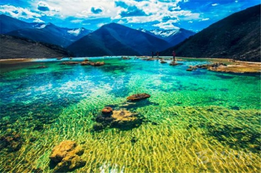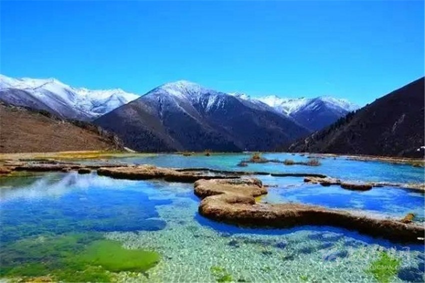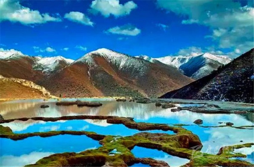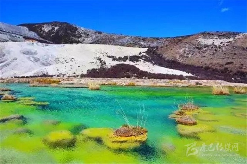 泉華灘海拔約4000米,屬于高山河谷草甸地貌。東南面就是貢嘎山,這里是觀看“蜀山之王”的絕佳位置。它因一種含有大量化學物質的泉水在地表產(chǎn)生化學沉淀而成,從另一個山頭傾斜下來大片的白色鈣化土,延伸到谷底后便變化出四層五彩的鈣化池。每個階地上有十幾個大小不同、形態(tài)各異的五色彩池,水深40-70厘米,彩池里水草相依,石花點點,疑為瑤池降臨人間!