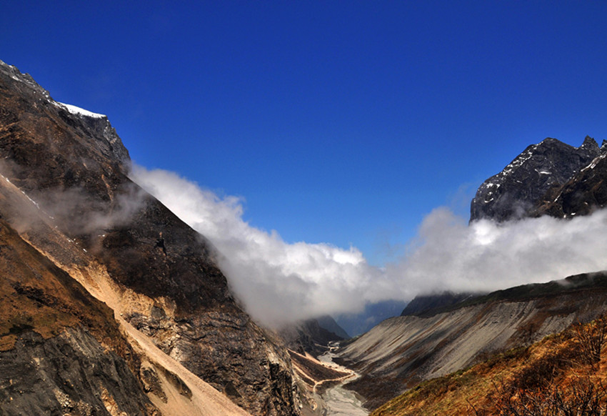 第二天,我們準(zhǔn)備游玩燕子溝,醒來(lái)的第一件事就是拉開窗簾看看天氣,又一陣興奮,天氣依然非常晴朗,今天是進(jìn)燕子溝的第一天,我早做足了準(zhǔn)備,太陽(yáng)帽、墨鏡、食品等等一樣不少。從磨西到燕子溝溝口的路程很長(zhǎng),需要坐景區(qū)的觀光車,因?yàn)樘鞖獾脑?,山上只有少些云霧繚繞,環(huán)在山腰,仿佛是一幅山水畫景。我們先來(lái)到了冰窖口,這里的海拔有三千多米,所幸大家都沒(méi)有高原反應(yīng),后坐車下山,來(lái)到有“定海神針”之稱的一棵高大筆直的杉樹。這棵杉樹皮粗厚,已經(jīng)沒(méi)有了樹葉,樹枝也寥寥無(wú)幾,更顯滄桑。站在樹下遙望,顯得人是那么渺小。不禁讓人遐想這顆千年古樹的滄桑歷史。然后開始步行游玩,這里海拔比較低,走 起來(lái)不是很累,在城市中見(jiàn)慣了高樓大廈,車水馬龍的我們,此刻真有一種離開凡塵,來(lái)到世外桃源的感覺(jué),我們一路依山而上,越走越高。我們終于來(lái)到了天藥水坪,這里的景色已經(jīng)完全不同于山下,看著遠(yuǎn)處的山,我們都不約而同地“哇”了一聲。