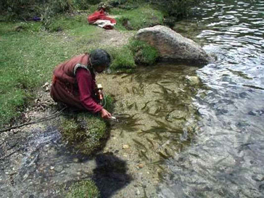 在湖邊的一塊平地上,有座被林莽掩映的廟宇,廟宇粉墻黛瓦,森嚴的大門銅環(huán)锃亮。棲息在原始森林中的藏馬雞與盤羊,跟寺院的喇嘛和尼姑建立了深厚的友情,相處得非常融洽。每年11月至來年5月,高山被茫茫大雪所覆蓋,大地披上了銀裝,這時候成群的動物到低處覓食,寺院利用這個機會,派人定時定點撒鹽巴和食物予以喂養(yǎng),漸漸使野生的動物們不再怕穿紅色袈裟的人,到后來居然無所顧忌地進入寺院覓食。