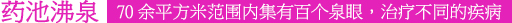 稱為藥泉的沸泉群水溫高達90℃,含有多種對人體有益的元素,不同的泉眼(如明目泉、健胃泉、洗腳泉等),分別對治療眼疾、胃病、風(fēng)濕等病癥具有不同的療效。