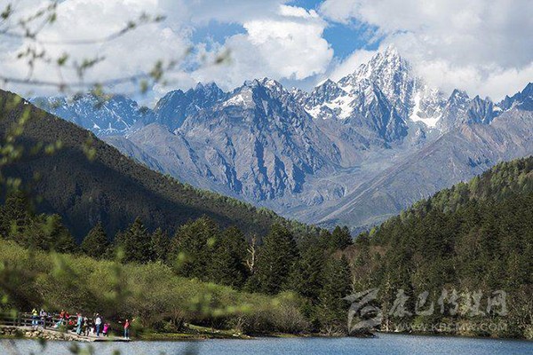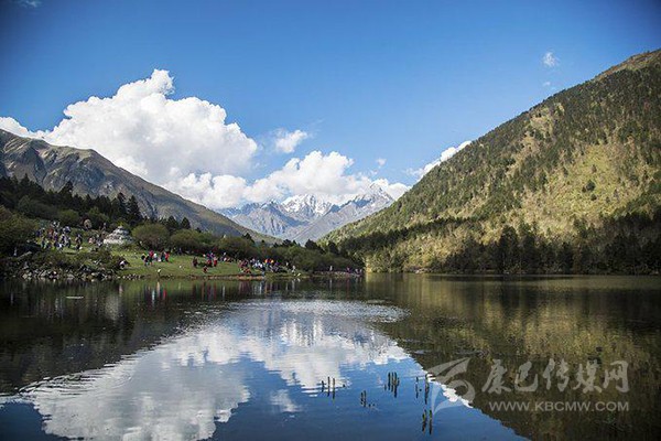 藥池沸泉一側(cè)是風(fēng)景秀美的俄瑪錯(cuò),上頂藍(lán)天白云和雪山,下踏森林綠水,讓人透心舒暢。