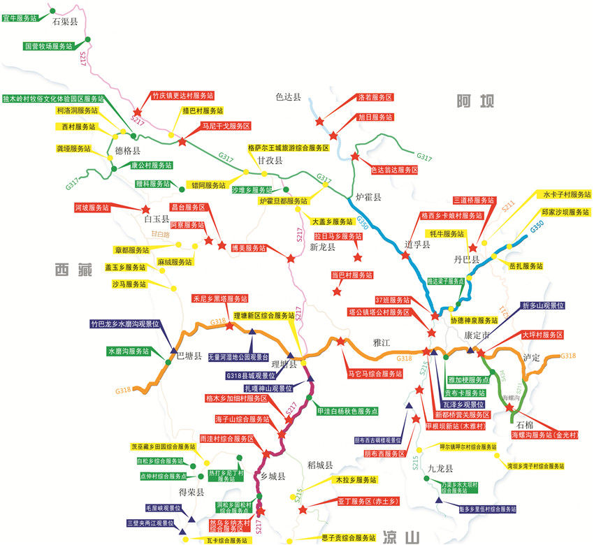 77個(gè)服務(wù)區(qū)(站、點(diǎn))地處我州六條旅游線路和十條景觀大道。主要集中在:G318線(瀘定——康定——雅江——理塘——巴塘),G350線(丹巴——八美——道孚——爐霍——色達(dá)),S217線(理塘——稻城——香格里拉鎮(zhèn)——亞丁),S211線、S434線(瀘定——海螺溝——榆林)。