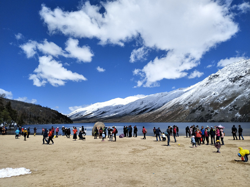 4月30日,筆者來到木格措景區(qū),看到售票大廳內人頭攢動,人氣火爆,游客有序的在窗口前、觀光車站前排隊等候,公安民警、景區(qū)管理人員在值勤巡邏,為前來咨詢的游客進行講解、帶路。