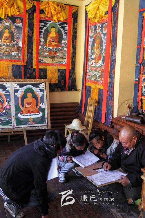11月11日,老師白馬澤仁在教幾個(gè)孩子唐卡繪畫基本功。