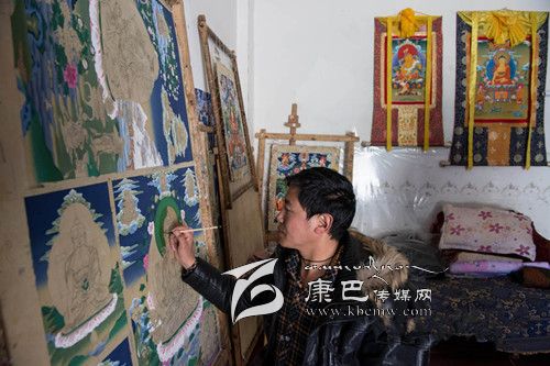 爐霍是一代唐卡宗師郎卡杰(約公元1610年生)的故鄉(xiāng),歷代傳承弟子風(fēng)格一脈相承,形成郎卡杰唐卡繪畫流派。該派作品的層次感,從花草樹(shù)木的枝葉前后層次,到山水房屋、飛禽走獸、人物器具的遠(yuǎn)近距離和明暗關(guān)系,都彰顯了三維立體的空間效果,繪畫中除了對(duì)主圖的精湛表現(xiàn),對(duì)局部結(jié)構(gòu)的精確處理和頻現(xiàn)微型畫像的神奇描繪,更是完美結(jié)合。郎卡杰本人作品《佛本身轉(zhuǎn)》、《二圣六莊嚴(yán)》等作品堪稱一絕。2008年,文化部授予爐霍“中國(guó)民間藝術(shù)之鄉(xiāng)——唐卡之鄉(xiāng)”。