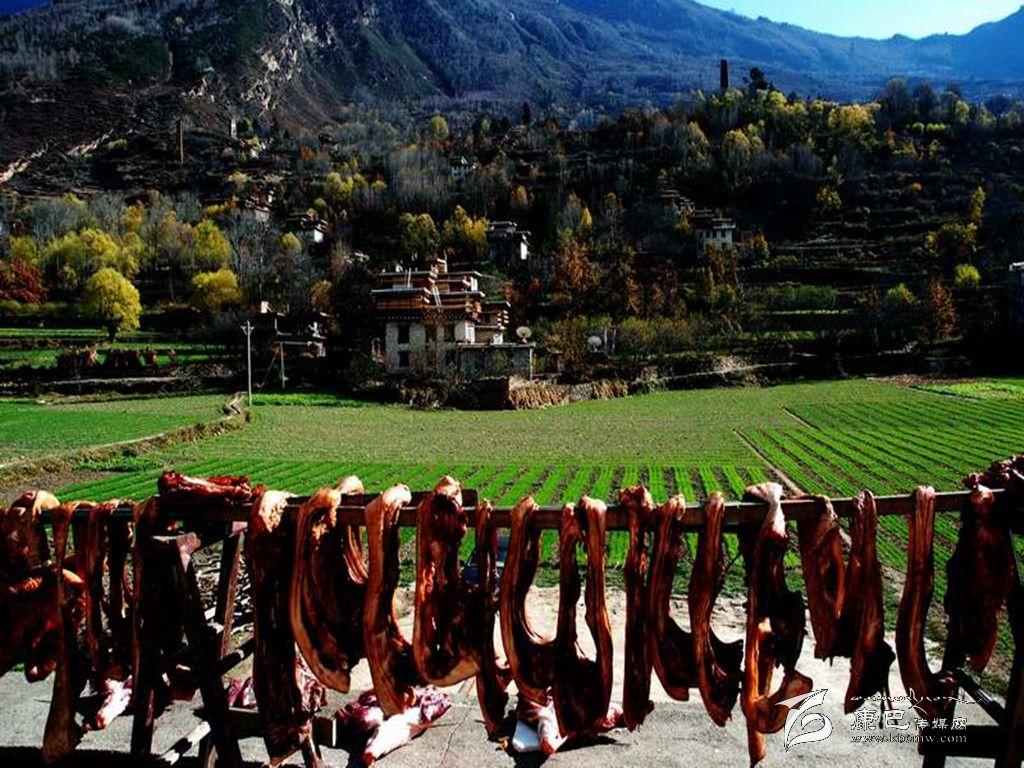 丹巴嘉絨藏族年期間,在酸菜包子、火燒饃、香豬腿等眾多的風(fēng)味飲食中,“藏香豬腿”是必不可缺的美食佳肴,也是給長(zhǎng)輩拜年和親朋好友間互送的最佳禮品。“藏香豬腿”的制作方式也象丹巴嘉絨藏族年一樣的獨(dú)特。丹巴人宰殺年豬的方式通常有用繩索死吊或者用刀從勁入殺心臟致死兩種,現(xiàn)在采用后一種方式宰殺豬居多。當(dāng)?shù)厝藢⒇i宰殺后用熱水燙,處理好豬毛,再在胸口用刀開(kāi)一孔,將手伸人胸腔扯斷心肺連接處,然后將其剖開(kāi),并把肥、瘦豬肉分離開(kāi),剝?nèi)グ逵?,處理好其他?nèi)臟,將豬腿按原形分離,爾后經(jīng)霜凍、柏枝熏、自然風(fēng)干后存放在儲(chǔ)藏室內(nèi)。豬腿存放一冬后,色、香、味俱佳。食用時(shí)煮成半熟或用炭火將表皮烘烤,切成小塊狀或撕成粉絲狀,在百米內(nèi)即可聞到香味,入口鮮嫩清香,營(yíng)養(yǎng)豐富,誘人食欲。