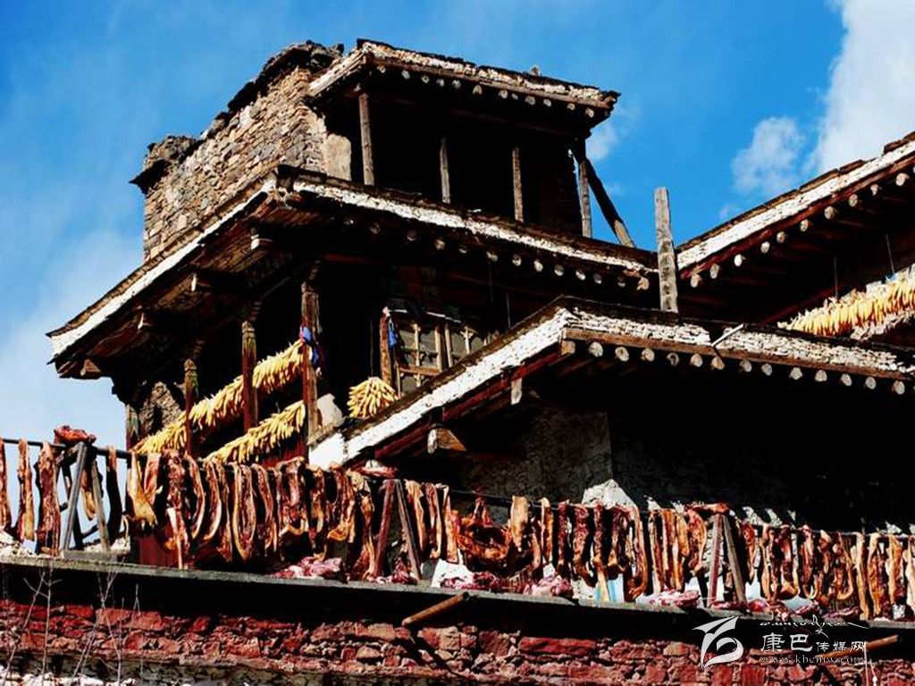 嘉絨藏族年到來(lái)之前幾天,丹巴藏寨格外耀眼美麗。寨房的主人們都依照傳統(tǒng)習(xí)俗,以當(dāng)?shù)氐?ldquo;白泥巴”為主要原料,通過(guò)配方煎制成白色染料,精心涂染寨樓墻面,并用白灰在墻面上繪畫(huà)出天、地、日、月、星和各種動(dòng)物圖案和宗教圖案,使整個(gè)藏寨披上潔白的盛裝。每年冬月12日就到了嘉絨藏族年大年三十,這天,山寨家家戶戶面滿柜、酒滿壇、水滿缸、柴滿棚,歡歡喜喜過(guò)迎新年;宰殺肥豬腌制香豬腿、制作豬膘,擺上酒席、跳上鍋莊祝福新年。