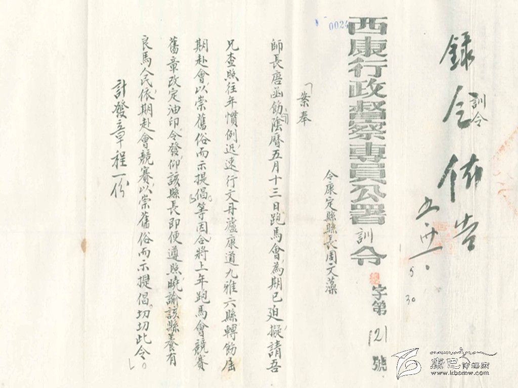 康定城各民族雜居,各種民族文化相融,形成了康定特有的民俗、風(fēng)俗。現(xiàn)在已經(jīng)不可能見到的“郭達(dá)將軍廟會”和每年“四月八轉(zhuǎn)山會”期間在康定城郊舉辦的“賽馬會”,這些屬于康定特有的民俗風(fēng)情,在民國時期曾經(jīng)盛況空前。舉辦“郭達(dá)將軍廟會”,警察要出來維持秩序。這份賽馬簡章特指1940年“四月八轉(zhuǎn)山會”時的一次賽馬。據(jù)《甘孜州志》記載:在1940年的5月,由于有“康定、瀘定、九龍、丹巴、道孚、乾寧”騎手參加賽馬活動,才制定了這份“新簡章”。