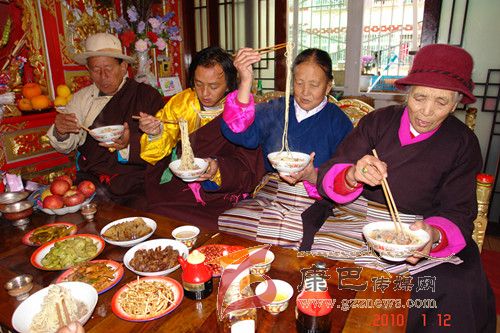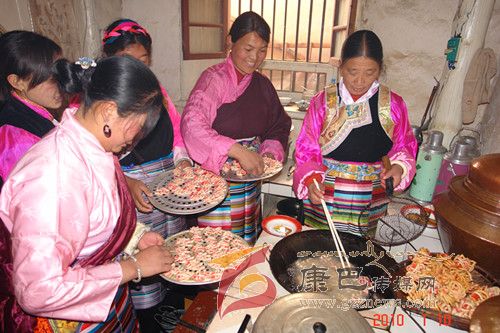巴塘人一年當中有很多重要的節(jié)日,而最重要的莫過于過春節(jié)。隨著農歷新年的來臨,巴塘人過春節(jié)的氛圍也越來越濃烈了。掃塵、貼春聯、殺年豬、罐血腸、樹經幡、獻“切瑪” 、曬牛肉干、做長面、炸“花茹” 、 釀青稞酒等等,人們臉上綻放出春天的笑顏,喜逐顏開迎候新春佳節(jié)的到來。而在眾多的風味飲食中,炸“花茹” 、 吃長面(當地人稱之為“金絲面”)是巴塘人春節(jié)時家筵中必不可缺的美食佳肴。