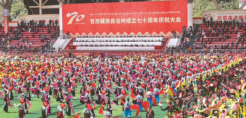 這一天,沿折多河兩岸的東西兩條大街上,人群如潮,青年學(xué)生的秧歌隊、腰鼓隊以及康定城各族各界人民組成的弦子隊,將古城康定揮舞成了一條人群歡樂的哈達,鞭炮聲、口號聲和歡呼聲響徹跑馬山麓。當晚,康定的四十八家鍋莊及主會場(后來的康定賓館內(nèi))燃起了一堆堆篝火,康定人民載歌載舞,通宵達旦,歡慶人民當家作主。