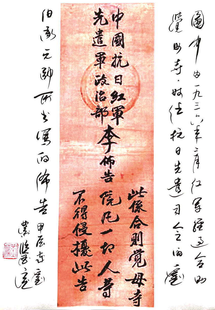 近日,1936年紅四方面軍長(zhǎng)征期間在四川省甘孜藏族自治州甘孜縣發(fā)布的一則關(guān)于覺母寺的布告,引起了紀(jì)念館、黨史界等多人關(guān)注,據(jù)劉伯承元帥之子劉蒙少將分析此布告是時(shí)任中國(guó)抗日紅軍先遣軍司令的劉伯承書寫。