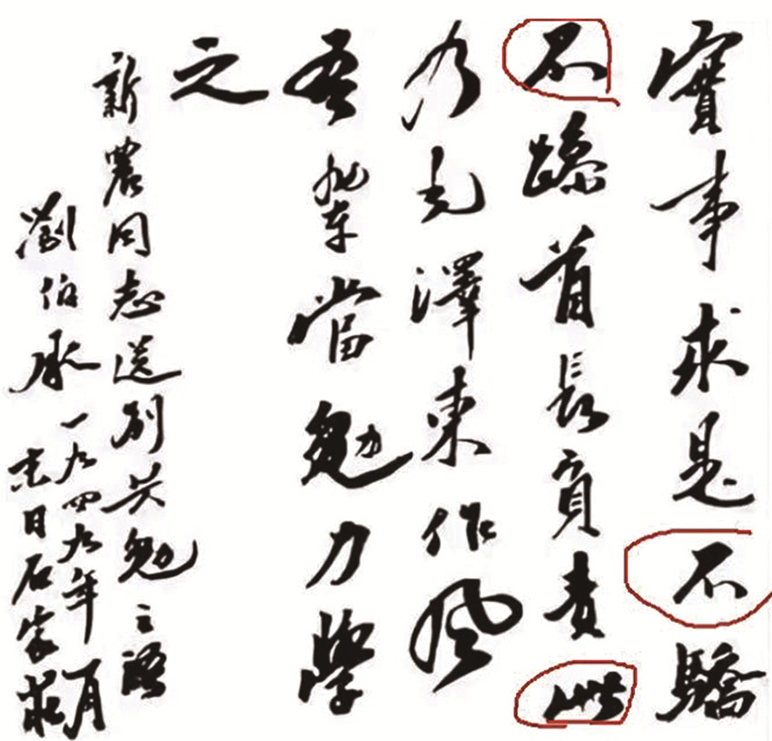 以上是劉帥1949年的書法,距離1936年13年的時(shí)間,“不” “此”二字,明顯與布告上的風(fēng)格一致。國(guó)、合、軍等單個(gè)的字,在建國(guó)后的書法作品與布告比較,都可以在劉帥其他書法中看到明顯出自一人。