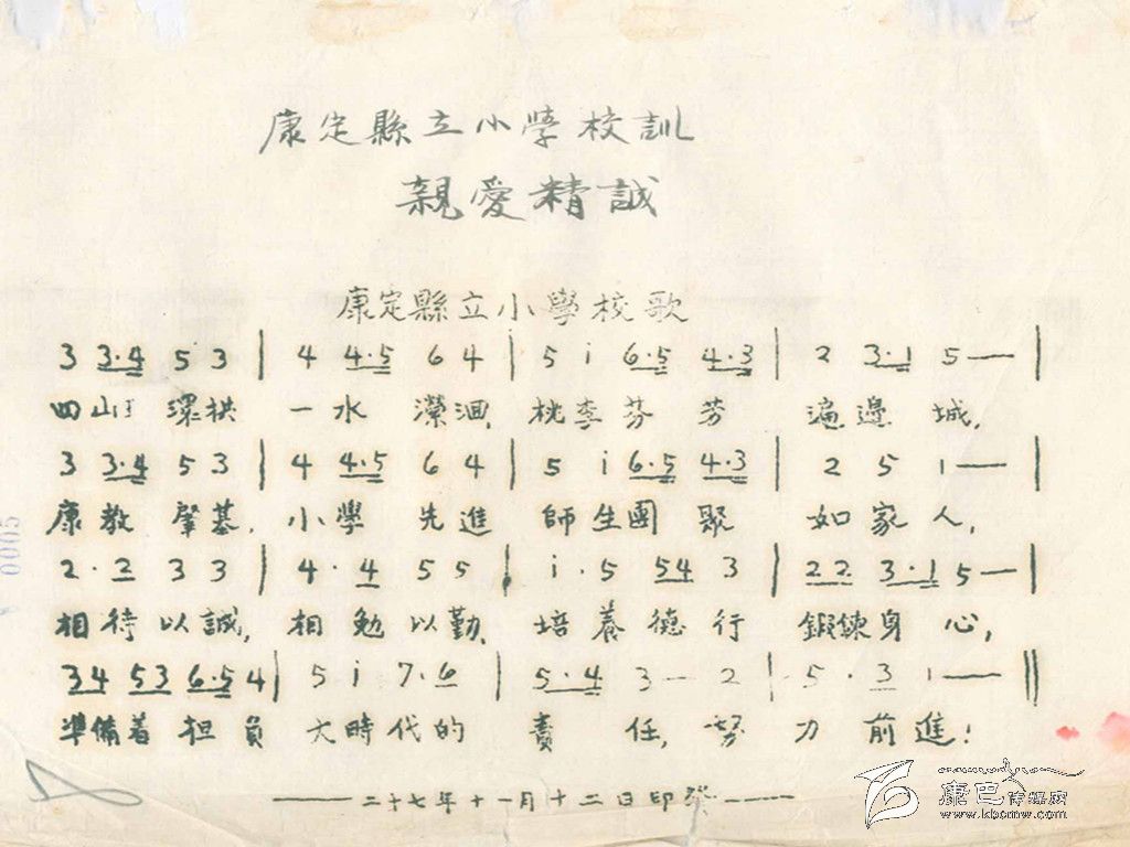 在眾多的民國教育檔案中,關(guān)于西康省各地學(xué)校的學(xué)生花名冊(cè)、學(xué)生成績(jī)表、學(xué)校經(jīng)費(fèi)運(yùn)用情況,以及教職工領(lǐng)取工薪的領(lǐng)條和表格等等有相當(dāng)大的一部分。難得的是,在這些檔案中竟然出現(xiàn)了兩份“歌譜”。細(xì)看卻不只是“歌譜”,而是兩所小學(xué)把自己學(xué)校的“校訓(xùn)”寫成的“校歌”。其中,一份是康定縣立小學(xué)依據(jù)校訓(xùn)“親愛精誠”寫成的校歌,另一份是日地短期小學(xué)依據(jù)校訓(xùn)“智仁勇”寫成的校歌。通過這兩份“校歌”,可以看到當(dāng)時(shí)小學(xué)教育已經(jīng)較為正軌,還開設(shè)有音樂課。“校歌”的內(nèi)容積極向上,充盈現(xiàn)在所說的“正能量”,鼓勵(lì)學(xué)生努力學(xué)習(xí),成為有擔(dān)當(dāng)?shù)娜恕?/div>