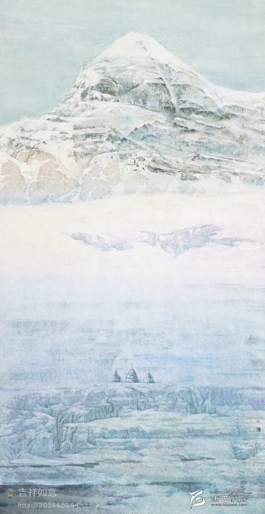 最后創(chuàng)作出了這張作品:神圣的岡仁波齊,您是世界中心;巍巍頂上是幾千年來,帝釋天的居所;山下積雪皚皚,在滿是瑪尼的巖壁下,是象征佛、法、僧的三座石塔,又宛如你忠實(shí)的信徒正在對(duì)你娓娓述說、虔誠祈禱。時(shí)間的河流,正在您腳下寂靜、流逝、封凍。